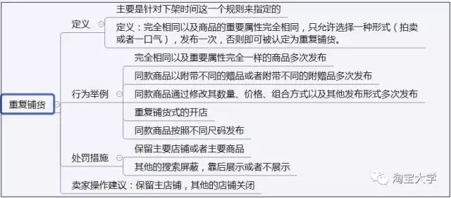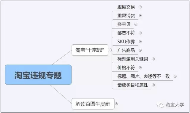 一般来说,淘宝重要的常见违规行为包括差不多十一种,如上面的思维导图所示:虚假交易、重复铺货、换宝贝、邮费不符、SKU作弊、广告商品、标题滥用关键词、价格不符、标题(图片、表述等不一致)、错放类目和属性、首图牛皮癣等。不同的违规行为,处罚的严重程度是不一样的;在相应等级的处罚下,处理措施也是不一样的。