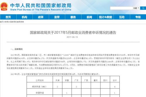 国家邮政局日前发布2017年5月邮政业消费者申诉情况的通告,通告显示,申诉中涉及快递服务问题的93225件,占总申诉量的95.8%。5月份消费者对快递企业申诉处理结果的满意率为96.2%。