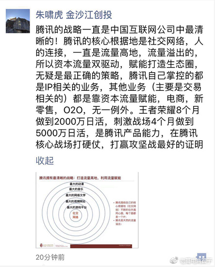 关于腾讯的梦想,金沙江创投董事总经理朱啸虎也在朋友圈评论此事。他表示,腾讯的战略一直是中国互联网公司中最清晰的。腾讯的核心根据地是社交网络,所以资本流量双驱动,赋能打造生态圈,无疑是最正确的策略。