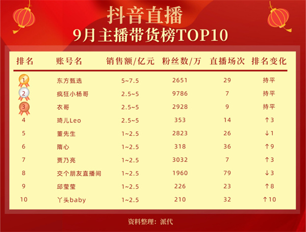 十一国庆假期刚刚过去,抖音平台的9月直播带货排行榜就已经新鲜出炉。
