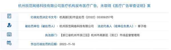 原来是雪梨名下的宸帆电商公司,因提供的产品医疗广告内容未取得《医疗广告审查证明》,而被杭州市高新区(滨江)市场监督管理局罚没13.4万余元。