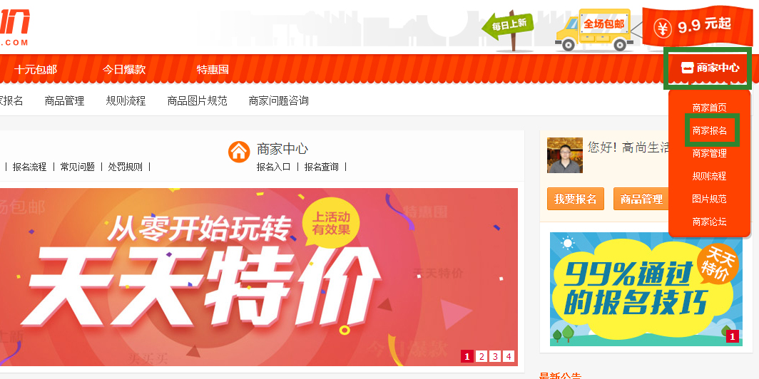 点击进入天天特价,在天天特价右上角的商家中心,把鼠标悬停在商家中心上,会出现一个下拉列表,在下拉列表中点击商家报名。