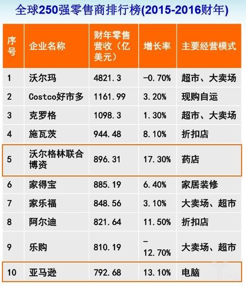 根据美国零售行业杂志《STORES》联合德勤(Deloitte)公布的2017全球250强零售商排行榜单前10来看,增长率最高的是聚焦医药领域、拥有4000多家连锁药店的沃尔格林!