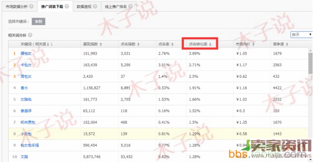 那么在培养中关键词应该如何取舍呢?利用直通车报表的数据进行分析,宝贝推广后观察账户的点击数据情况,利用市场数据来检验关键词的好坏: