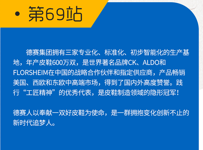 德赛集团拥有三家专业化、标准化、初步智能化的生产基地,年产皮鞋600万双,是CK、AIDO和FIORSHEIM在中国的战略合作伙伴和供应商,产品远销美国、西欧和东欧高端市场